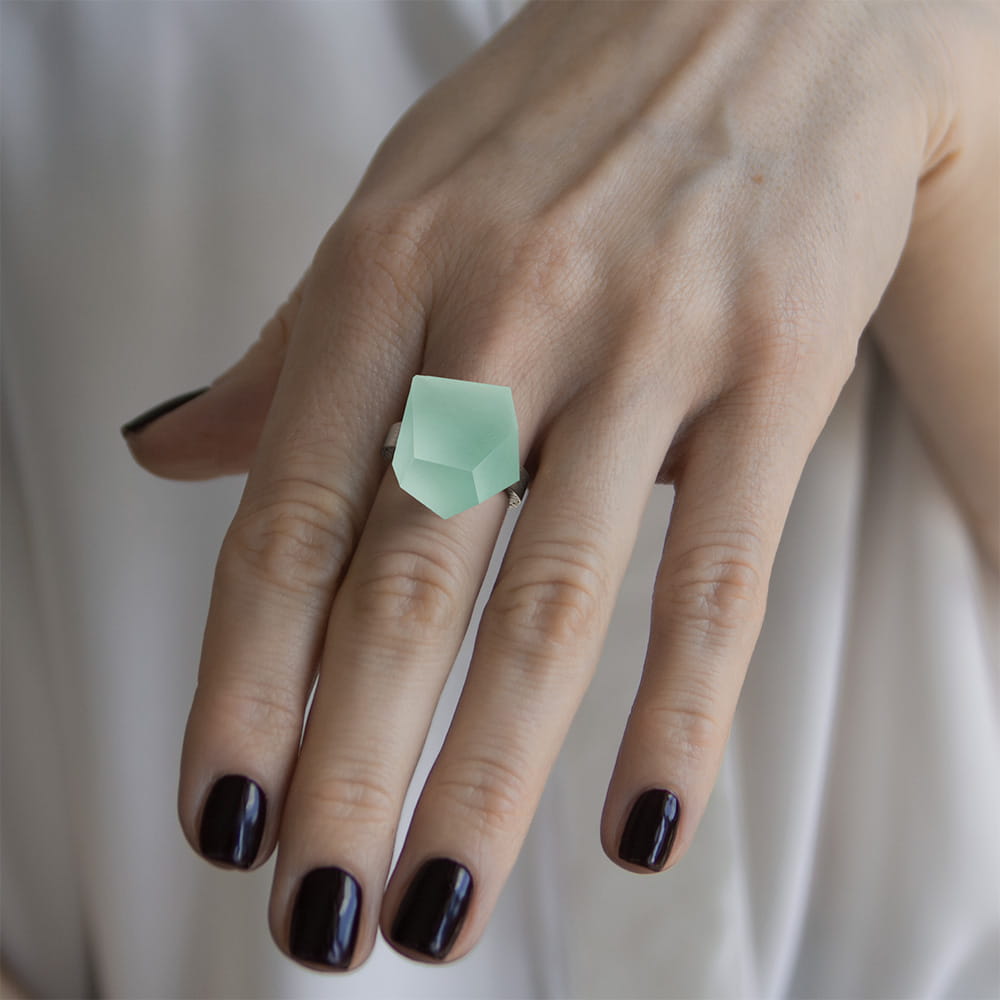 The crystal’s distinctive construction and the precise cut of the synthetic resin create an effect of inner glow and a refined, satin-like surface.